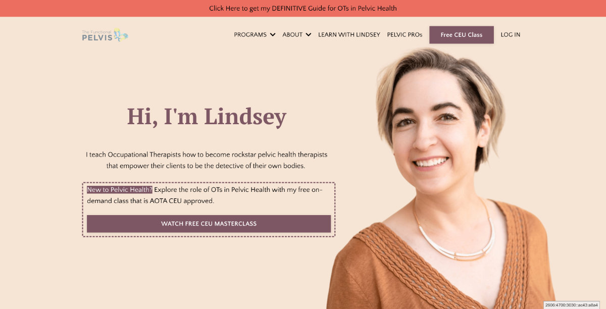 “My private practice and background has been in providing pelvic health services, and it is an incredible joy and pleasure to be able to help other occupational therapists step into this incredibly fulfilling role that dramatically impacts our clients’ quality of life.”